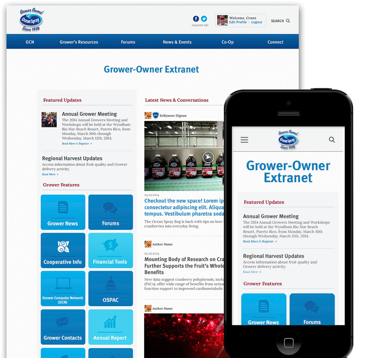 Ocean Spray is a cooperative of multi-generational growers all over the United States and beyond. To aid the majority of growers in the US, I creates a responsive website for growers to use as a tool in their daily farming and business practices. Clarity and organization were the primary needs as the content contained was both complex and imperative to growers' livlihoods.